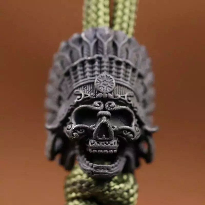 Paracord ozdoba ve stylu lebky s nasazenou indiánskou čelenkou.